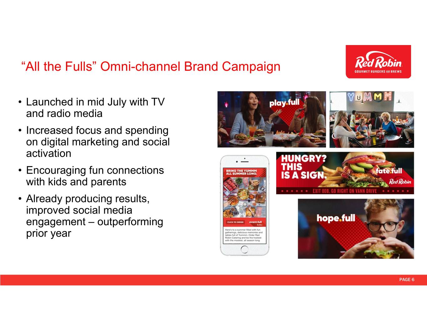 Key Strategies to Deliver Value to Shareholders Our Five 2019 Strategic Priorities: • Stabilizing the dine-in business • Improving Guest experience and recapturing Red Robin’s known-for “Gift of Time” convenience • Continue building To-Go and Catering business • Implementing digital platforms and restaurant technology solutions • Selectively refranchising and reassessing real estate portfolio PAGE 5