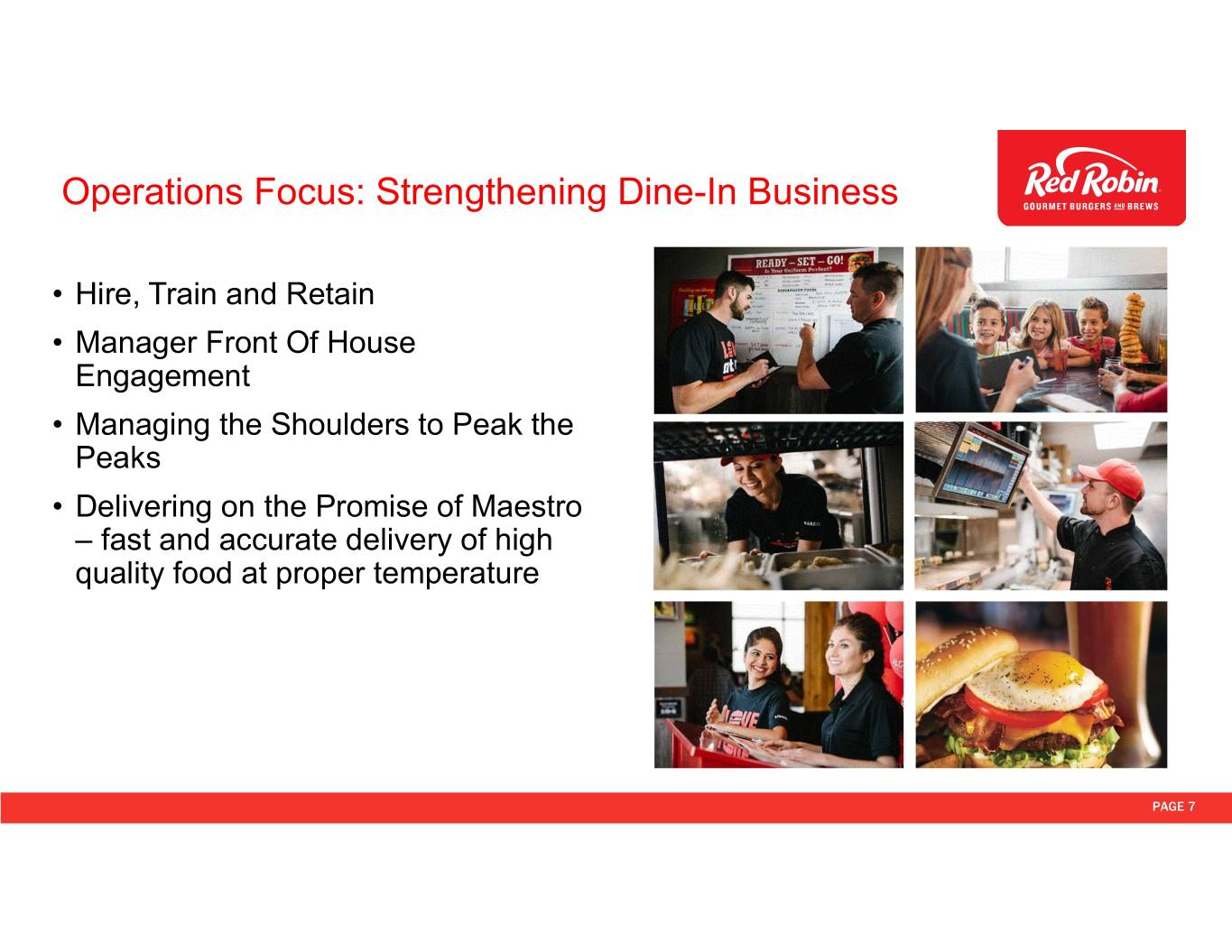 Operations Focus: Strengthening Dine-In Business • Hire, Train and Retain • Manager Front Of House Engagement • Managing the Shoulders to Peak the Peaks • Delivering on the Promise of Maestro – fast and accurate delivery of high quality food at proper temperature PAGE 7