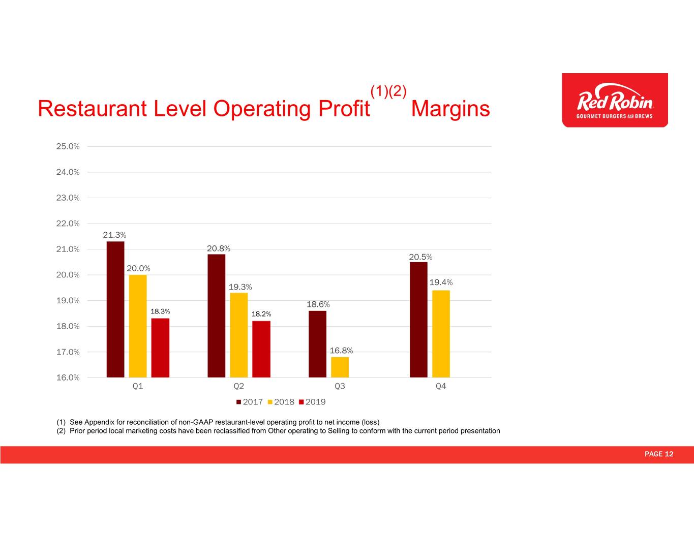 (1)(2) Restaurant Level Operating Profit Margins 25.0% 24.0% 23.0% 22.0% 21.3% 21.0% 20.8% 20.5% 20.0% 20.0% 19.4% 19.3% 19.0% 18.6% 18.3% 18.2% 18.0% 17.0% 16.8% 16.0% Q1 Q2 Q3 Q4 2017 2018 2019 (1) See Appendix for reconciliation of non-GAAP restaurant-level operating profit to net income (loss) (2) Prior period local marketing costs have been reclassified from Other operating to Selling to conform with the current period presentation PAGE 12