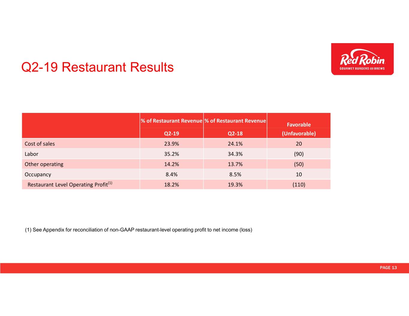 Q2-19 Restaurant Results % of Restaurant Revenue % of Restaurant Revenue Favorable Q2-19 Q2-18 (Unfavorable) Cost of sales 23.9% 24.1% 20 Labor 35.2% 34.3% (90) Other operating 14.2% 13.7% (50) Occupancy 8.4% 8.5% 10 Restaurant Level Operating Profit(1) 18.2% 19.3% (110) (1) See Appendix for reconciliation of non-GAAP restaurant-level operating profit to net income (loss) PAGE 13
