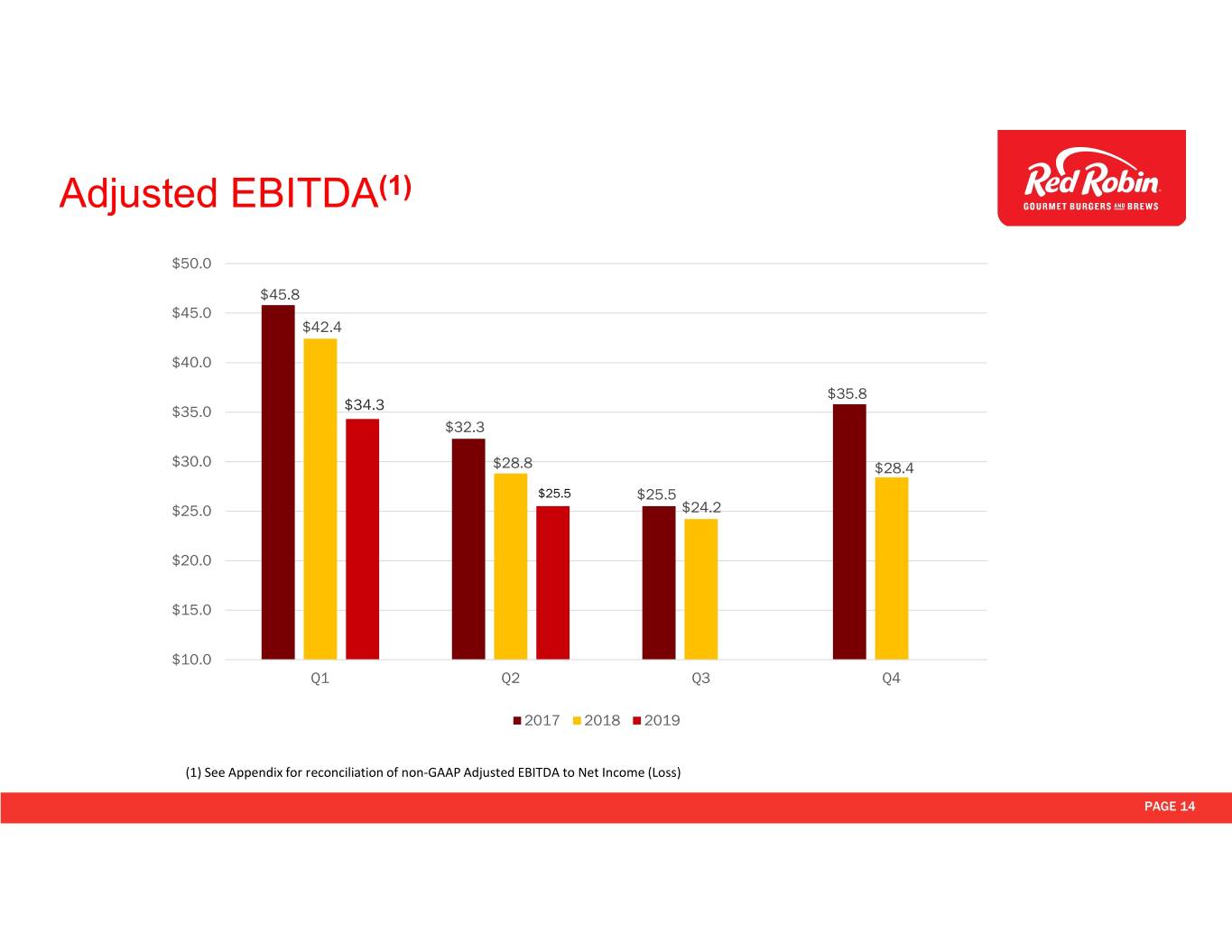 EBITDA and Adjusted EBITDA Reconciliation to Net Income (Loss) ($ in thousands) 2017 2018 2019 Q1 Q2 Q3 Q4 Q1 Q2 Q3 Q4 Q1 Q2 Net income (loss) as reported $ 11,567 $ 6,931 $ 2,714 $ 8,807 $ 4,380 $ (1,874) $ 1,709 $(10,634) $ 639 $ 981 Adjustments to net income (loss): Income tax expense (benefit) 2,907 (18) (690) (3,198) (768) (4,725) (2,199) (7,299) (476) (15,986) Interest expense, net 3,249 2,626 2,222 2,821 3,277 2,458 2,390 2,550 3,345 2,322 Depreciation and amortization 28,044 21,173 21,258 22,070 29,193 22,323 21,819 22,036 28,438 21,369 EBITDA $ 45,767 $ 30,712 $ 25,504 $ 30,500 $ 36,082 $ 18,182 $ 23,719 $ 6,653 $ 31,946 $ 8,686 Executive transition and severance - - - - - - - - 1,994 370 Board and shareholder matter costs - - - - - - - - - 1,152 Asset impairment - 1,584 - 5,330 - 9,643 - 18,483 - 14,064 Litigation contingencies - - - - 4,000 - - 795 - - Restaurant closure costs - - - - - - - - 304 1,001 Spiral menu disposal - - - - - 506 - 2,430 - - Reorganization costs - - - - 2,287 466 521 - - - Executive retention - - - - - - - - 100 260 Adjusted EBITDA 45,767 32,296 25,504 35,830 42,369 28,797 24,240 28,361 34,344 25,533 PAGE 24