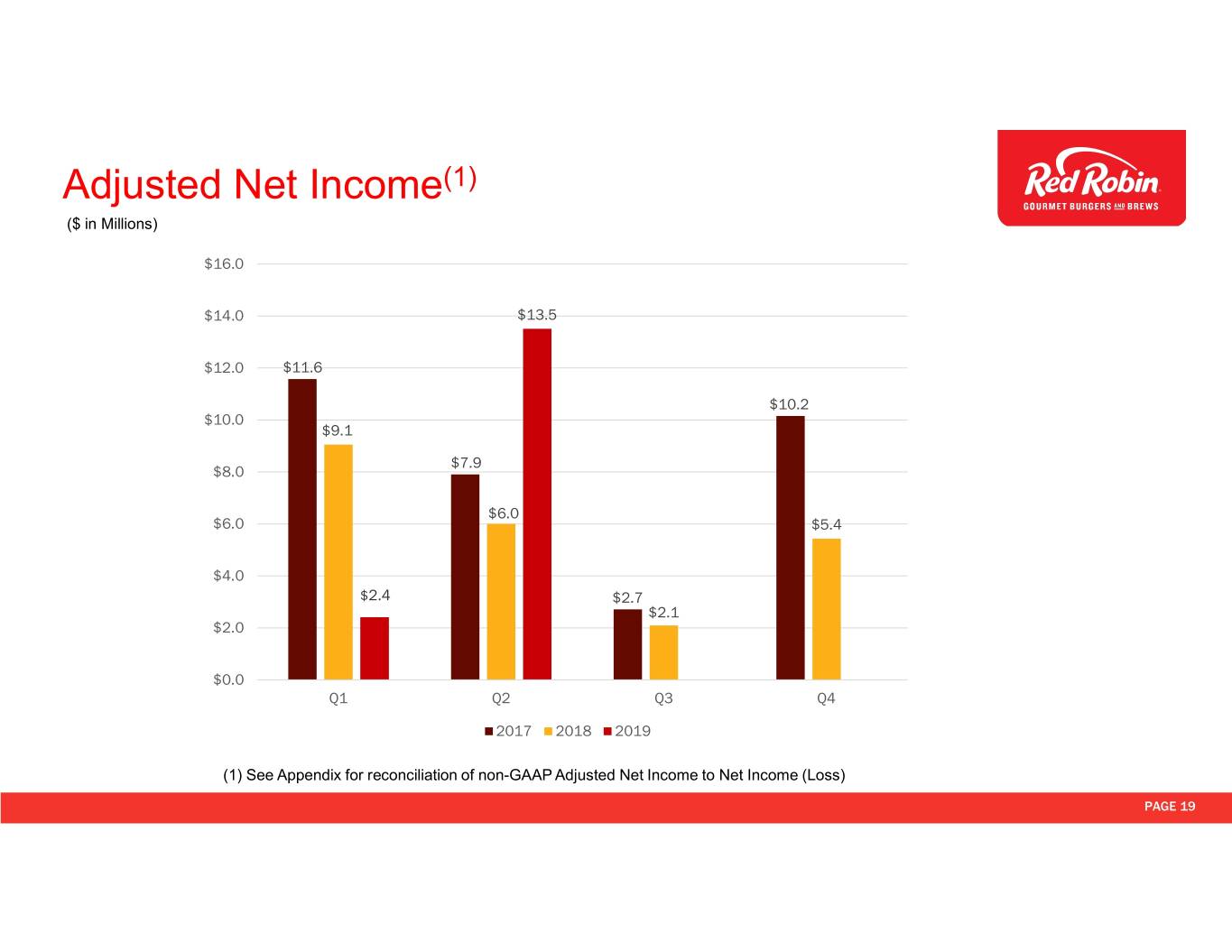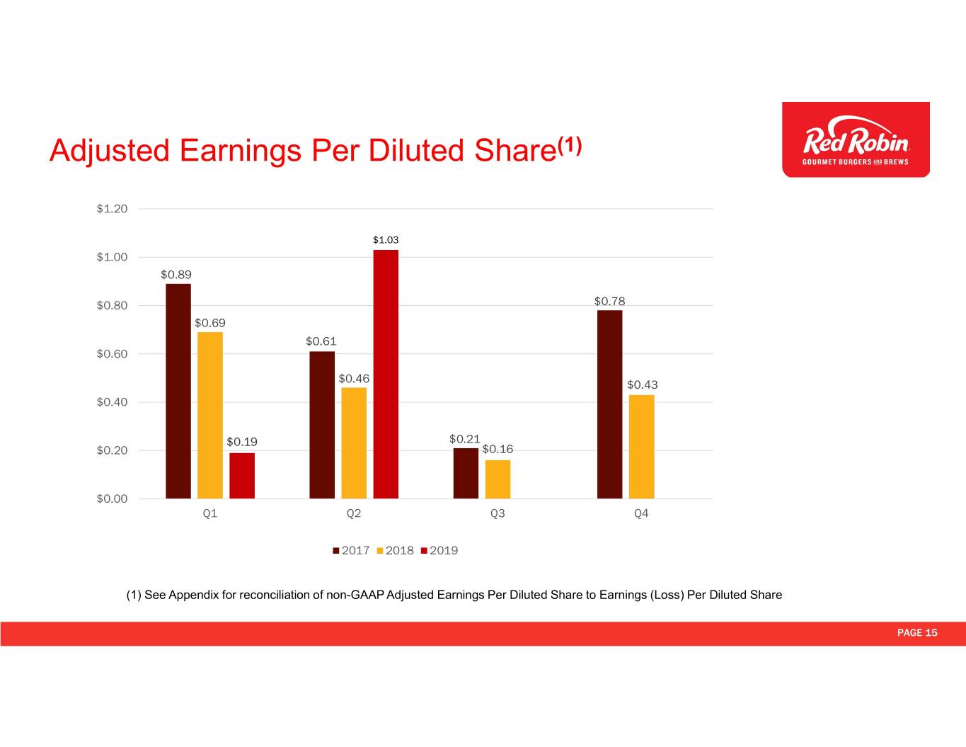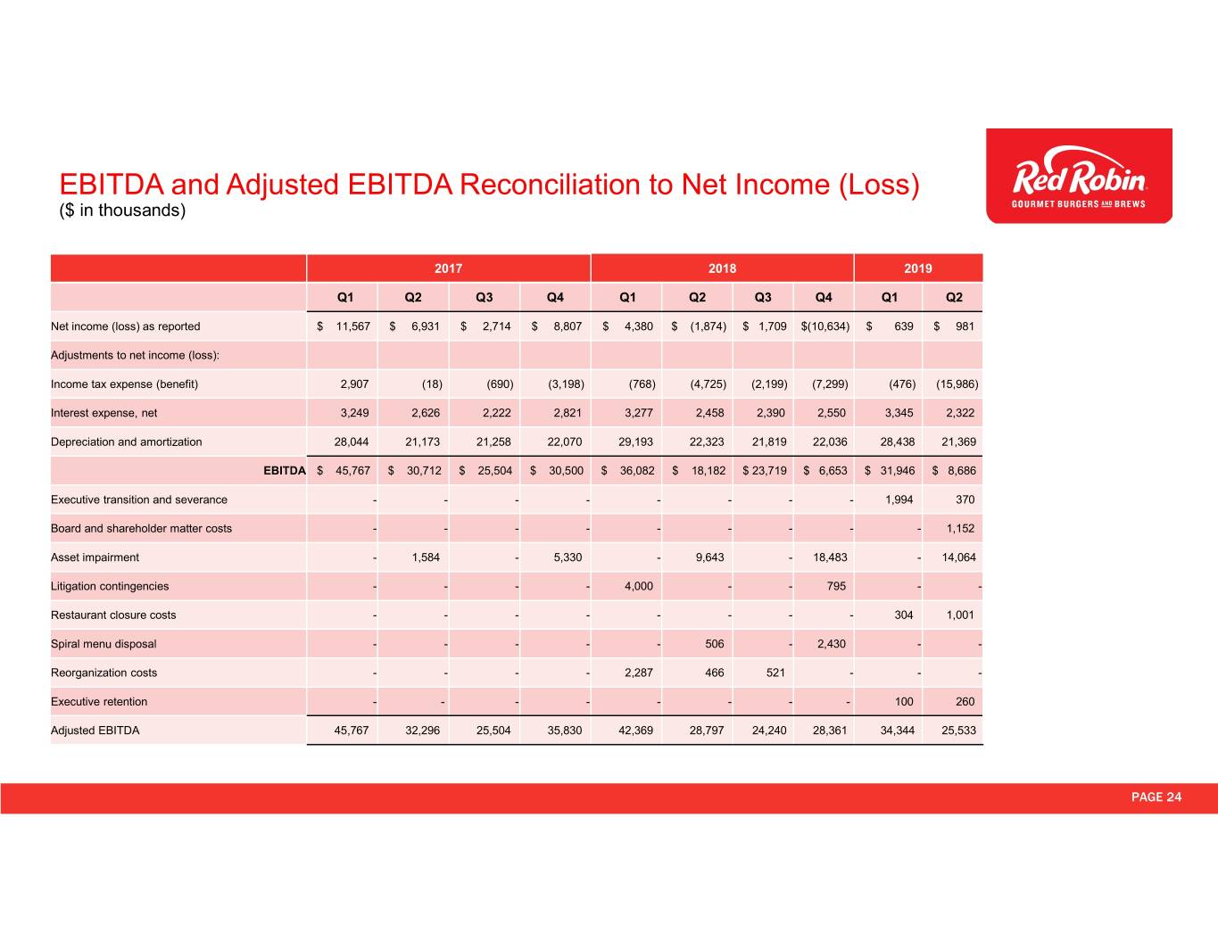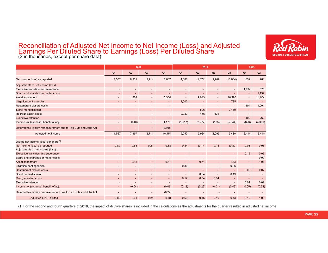 Reconciliation of Adjusted Net Income to Net Income (Loss) and Adjusted Earnings Per Diluted Share to Earnings (Loss) Per Diluted Share ($ in thousands, except per share data) 2017 2018 2019 Q1 Q2 Q3 Q4 Q1 Q2 Q3 Q4 Q1 Q2 Net income (loss) as reported 11,567 6,931 2,714 8,807 4,380 (1,874) 1,709 (10,634) 639 981 Adjustments to net income (loss): Executive transition and severance - - - - - - - - 1,994 370 Board and shareholder matter costs - - - - - - - - - 1,152 Asset impairment - 1,584 - 5,330 - 9,643 - 18,483 - 14,064 Litigation contingencies - - - - 4,000 - - 795 - - Restauarant closure costs - - - - - - - - 304 1,001 Spiral menu disposal - - - - - 506 - 2,430 - - Reorganization costs - - - - 2,287 466 521 - - - Executive retention - - - - - - - - 100 260 Income tax (expense) benefit of adj. - (618) - (1,175) (1,617) (2,777) (135) (5,644) (623) (4,380) Deferred tax liability remeasurement due to Tax Cuts and Jobs Act - - - (2,808) - - - - - - Adjusted net income 11,567 7,897 2,714 10,154 9,050 5,964 2,095 5,430 2,414 13,448 Diluted net income (loss) per share(1): Net income (loss) as reported 0.89 0.53 0.21 0.68 0.34 (0.14) 0.13 (0.82) 0.05 0.08 Adjustments to net income (loss): Executive transition and severance - - - - - - - - 0.15 0.03 Board and shareholder matter costs - - - - - - - - - 0.09 Asset impairment - 0.12 - 0.41 - 0.74 - 1.43 - 1.08 Litigation contingencies - - - - 0.30 - - 0.06 - - Restauarantclosure costs - - - - - - - - 0.03 0.07 Spiral menu disposal - - - - - 0.04 - 0.19 - - Reorganization costs - - - - 0.17 0.04 0.04 - - - Executive retention - - - - - - - - 0.01 0.02 Income tax (expense) benefit of adj. - (0.04) - (0.09) (0.12) (0.22) (0.01) (0.43) (0.05) (0.34) Deferred tax liability remeasurement due to Tax Cuts and Jobs Act - - - (0.22) - - - - - - Adjusted EPS -diluted 0.89 0.61 0.21 0.78 0.69 0.46 0.16 0.43 0.19 1.03 (1) For the second and fourth quarters of 2018, the impact of dilutive shares is included in the calculations as the adjustments for the quarter resulted in adjusted net income PAGE 22