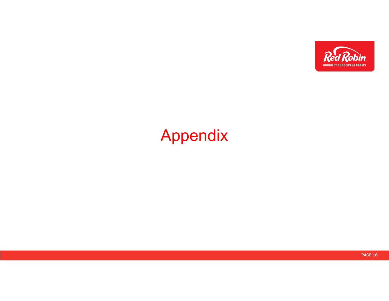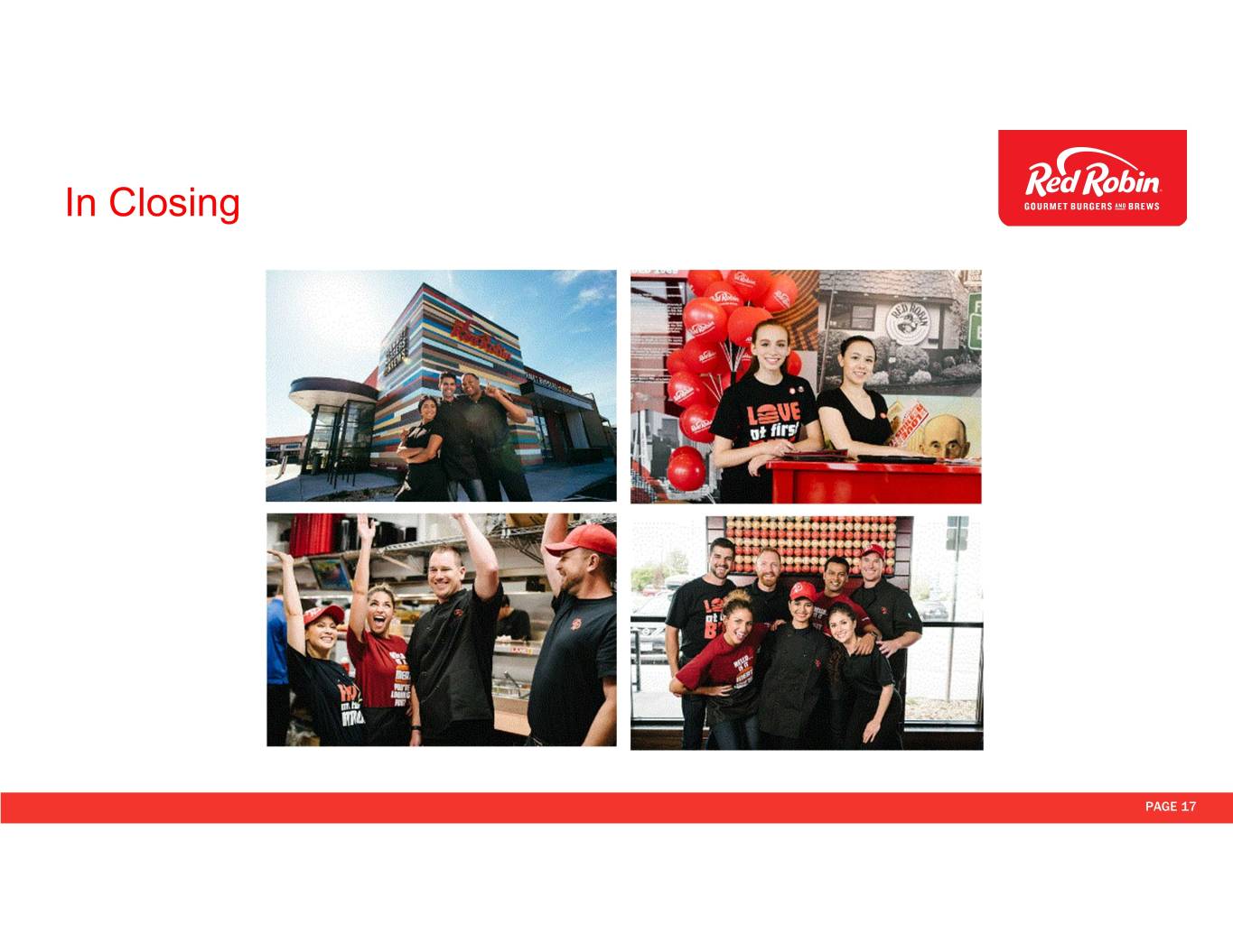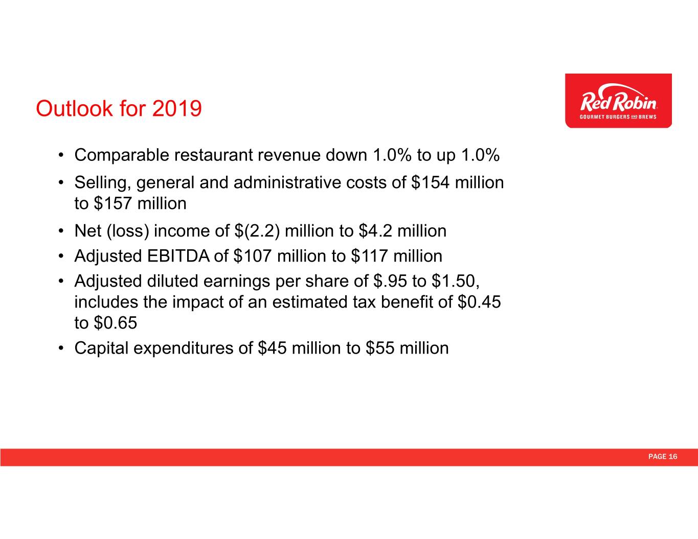Outlook for 2019 • Comparable restaurant revenue down 1.0% to up 1.0% • Selling, general and administrative costs of $154 million to $157 million • Net (loss) income of $(2.2) million to $4.2 million • Adjusted EBITDA of $107 million to $117 million • Adjusted diluted earnings per share of $.95 to $1.50, includes the impact of an estimated tax benefit of $0.45 to $0.65 • Capital expenditures of $45 million to $55 million PAGE 16