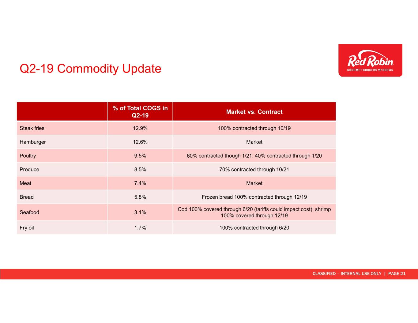 Q2-19 Commodity Update % of Total COGS in Market vs. Contract Q2-19 Steak fries 12.9% 100% contracted through 10/19 Hamburger 12.6% Market Poultry 9.5% 60% contracted though 1/21; 40% contracted through 1/20 Produce 8.5% 70% contracted through 10/21 Meat 7.4% Market Bread 5.8% Frozen bread 100% contracted through 12/19 Cod 100% covered through 6/20 (tariffs could impact cost); shrimp Seafood 3.1% 100% covered through 12/19 Fry oil 1.7% 100% contracted through 6/20 CLASSIFIED – INTERNAL USE ONLY | PAGE 21