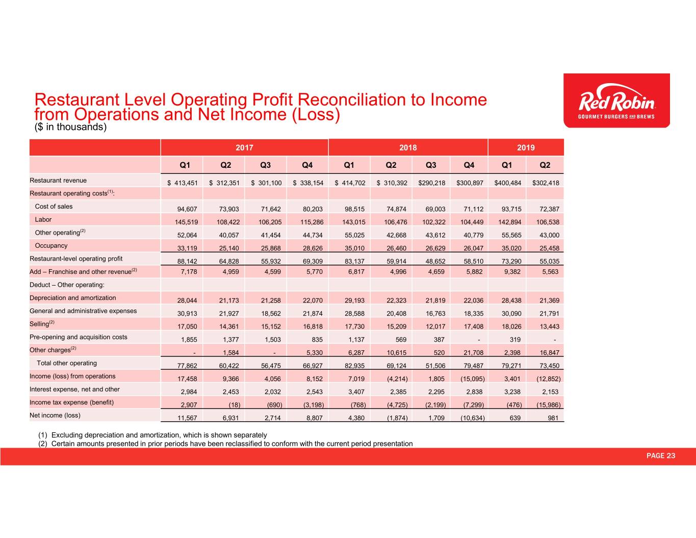 Restaurant Level Operating Profit Reconciliation to Income from Operations and Net Income (Loss) ($ in thousands) 2017 2018 2019 Q1 Q2 Q3 Q4 Q1 Q2 Q3 Q4 Q1 Q2 Restaurant revenue $ 413,451 $ 312,351 $ 301,100 $ 338,154 $ 414,702 $ 310,392 $290,218 $300,897 $400,484 $302,418 Restaurant operating costs(1): Cost of sales 94,607 73,903 71,642 80,203 98,515 74,874 69,003 71,112 93,715 72,387 Labor 145,519 108,422 106,205 115,286 143,015 106,476 102,322 104,449 142,894 106,538 (2) Other operating 52,064 40,057 41,454 44,734 55,025 42,668 43,612 40,779 55,565 43,000 Occupancy 33,119 25,140 25,868 28,626 35,010 26,460 26,629 26,047 35,020 25,458 Restaurant-level operating profit 88,142 64,828 55,932 69,309 83,137 59,914 48,652 58,510 73,290 55,035 Add – Franchise and other revenue(2) 7,178 4,959 4,599 5,770 6,817 4,996 4,659 5,882 9,382 5,563 Deduct – Other operating: Depreciation and amortization 28,044 21,173 21,258 22,070 29,193 22,323 21,819 22,036 28,438 21,369 General and administrative expenses 30,913 21,927 18,562 21,874 28,588 20,408 16,763 18,335 30,090 21,791 (2) Selling 17,050 14,361 15,152 16,818 17,730 15,209 12,017 17,408 18,026 13,443 Pre-opening and acquisition costs 1,855 1,377 1,503 835 1,137 569 387 - 319 - (2) Other charges - 1,584 - 5,330 6,287 10,615 520 21,708 2,398 16,847 Total other operating 77,862 60,422 56,475 66,927 82,935 69,124 51,506 79,487 79,271 73,450 Income (loss) from operations 17,458 9,366 4,056 8,152 7,019 (4,214) 1,805 (15,095) 3,401 (12,852) Interest expense, net and other 2,984 2,453 2,032 2,543 3,407 2,385 2,295 2,838 3,238 2,153 Income tax expense (benefit) 2,907 (18) (690) (3,198) (768) (4,725) (2,199) (7,299) (476) (15,986) Net income (loss) 11,567 6,931 2,714 8,807 4,380 (1,874) 1,709 (10,634) 639 981 (1) Excluding depreciation and amortization, which is shown separately (2) Certain amounts presented in prior periods have been reclassified to conform with the current period presentation PAGE 23