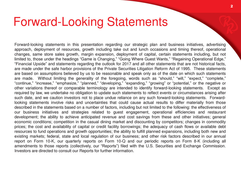 Forward-looking statements in this presentation regarding our strategic plan and business initiatives, advertising